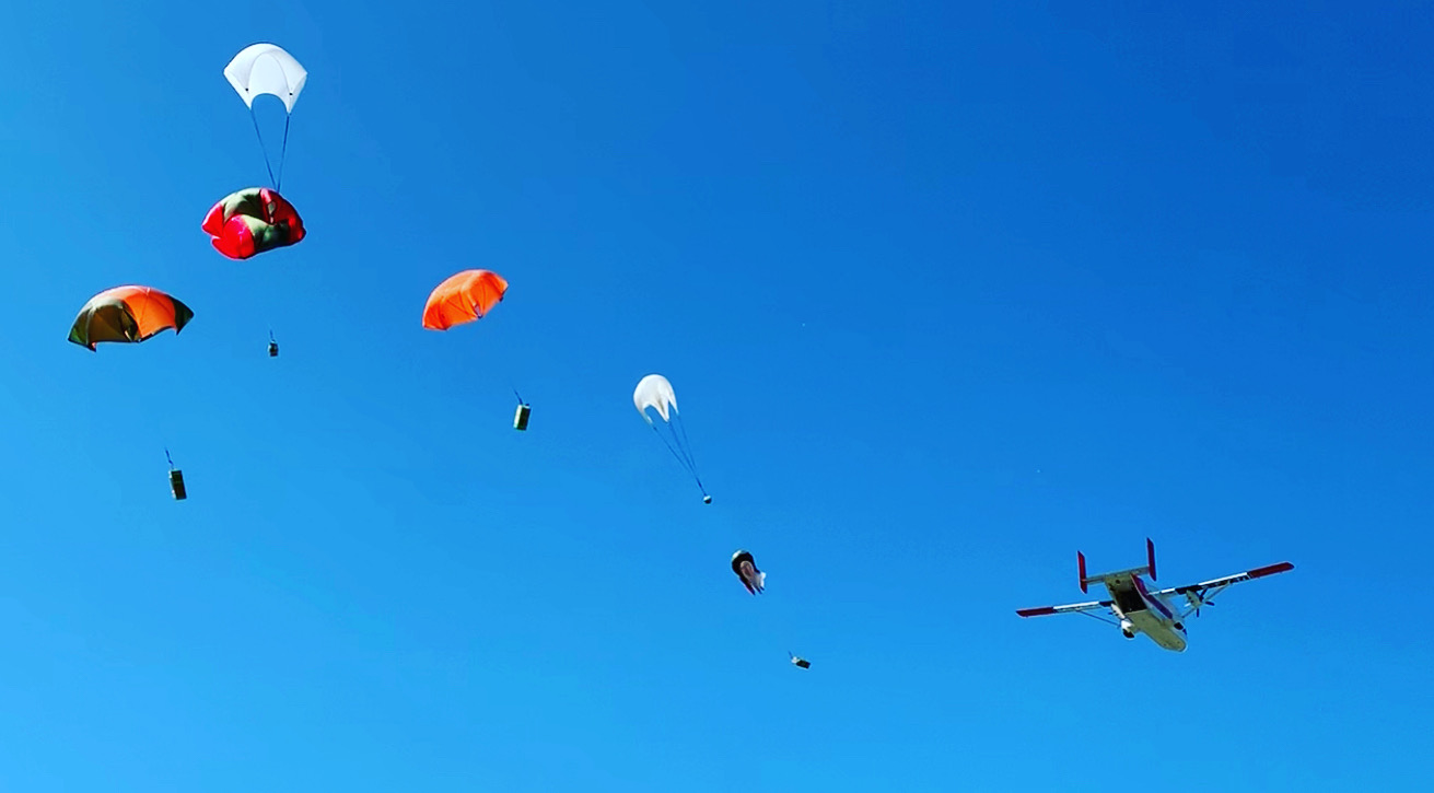 Once a jump spot is decided on jumpers will go into jump operations. Jumpers leave the plane at 3000 ft above ground level. A drogue chute is deployed by static line as they leave the plane and jumpers go through a short jump count before deploying their main parachute. Jumpers then fly their parachutes into what are sometimes very small clearings in the forest. Once all jumpers are on the ground safely the jump ship will make low passes dropping cargo. This cargo consists of firefighting tools (chainsaws and pulaskis), food (think MRE’s, Top Ramen, and Spam), drinking water, and sleeping bags. Anything else a jumper wants on a fire must be carried on his person when he jumps in. This is where the work begins. Cargo is collected and gear is stashed and the jumpers make their way to the fire edge. Using the tools dropped to them they remove all vegetation from the edge of the fire which prevents the fire from growing.